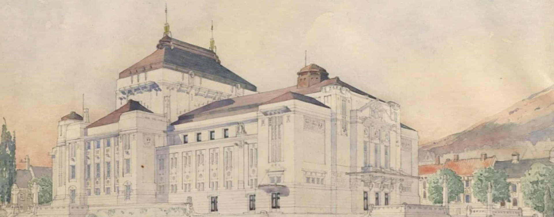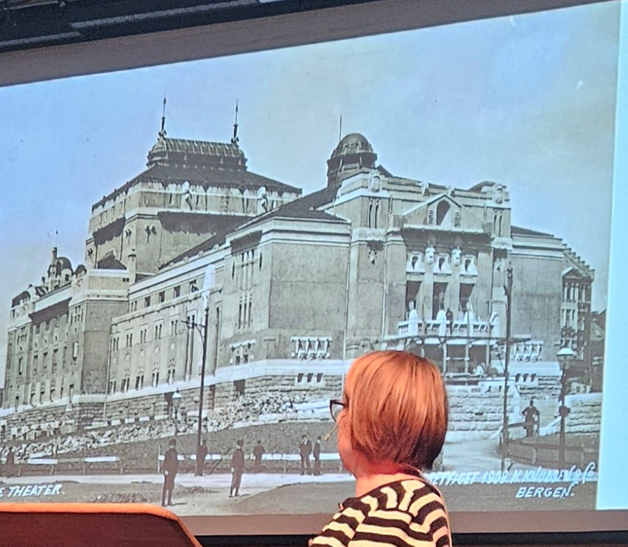 I går, onsdag 1. oktober, tok Ingfrid Bækken oss med på en tørrskodd og lærerik byvandring, en digital byvandring. Turen begynte ved Den Nationale Scene, byens stolthet, hvor vi fikk en grundig gjennomgang av bygget både utvendig og innvendig. DNS er et hovedverk blant jugendbygg i Norge, tegnet av arkitekten Einar Oscar Schou (1877-1966) og åpnet i 1909.