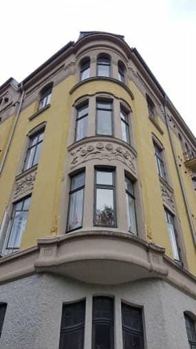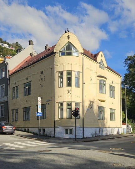 geometriske former som utsmykningsdetaljer. Et annet særtrekk for j ugendstilen var også å benytte seg av asymmetri i utformingen, ofte gjennomført på svært subtilt vis. Begrepet gesamtkunstverk ble gjerne brukt om den nye stilen. Alt skulle henge sammen og danne et hele; arkitektur, interiør, møbler og belysning. Arkitekt Schou tegnet selv det meste i teateret, interiørene, møblene og lysekronene. Jugendstilen ble ikke veldig utbredt i Norge. Det var byggekrakk i landet tidlig i det 20-århundre og følgelig liten byggeaktivitet. Unntaket er Ålesund som på grunn av bybrannen i 1904 fikk en helt "ny by" i jugendstil og fikk således en av Europas mest konsentrerte samling av jugendarkitektur på et område. Likevel, til tross for liten utbredelse av stilen her i landet, har vi noen flotte jugendbygg i Oslo og Trondheim, men også i Bergen. Foruten arkitekt Schou var det flere andre bergensarkitekter som tegnet jugendbygg i Bergen, som Daniel Muri (1879-1957), Egill Reimers (1878-1946), Jens Zetlitz Monrad Kielland(1866-1926) og Schak Bull (1858-1956). I løpet av byvandringen fra teatret til Kalfarlien og deretter tilbake til sentrum, fikk vi se mange ulike eksempler på jugendboliger med ulik utforming og med flotte og spennende dekordetaljer. Det var for eksempel bygg med hettelignende takkonstruksjoner, vinduer som var typiske for jugendstilen, de var gjerne smale og tredelte, men bundet sammen av en bue og satt rett inn i veggen. Vindusrutene hadde ofte store felt nederst og flere småruter i øverste felt.