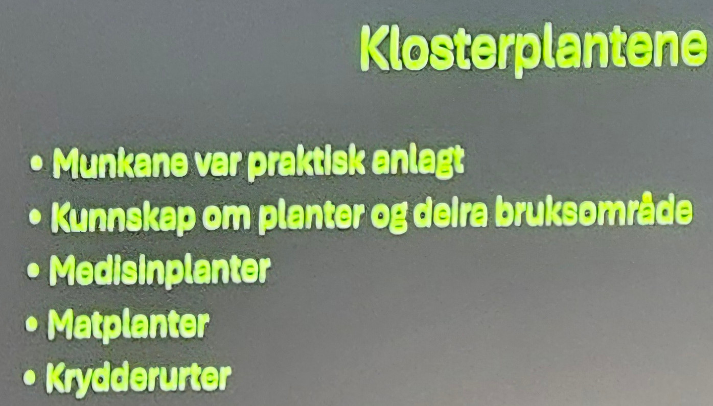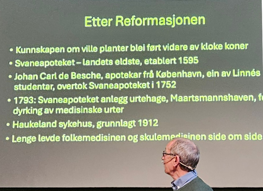 I forelesningen fikk vi et dypdykk i Bergens flora og fauna. Anders Lundberg, pensjonert professor i geografi fra Universitetet i Bergen, har skrevet boken Bergen, naturligvis!, og med den som utgangspunkt fikk vi presentert flotte bilder og fortalt historier om spesielle naturopplevelser i byens nærområder. Blant annet ble vi fortalt at Norges eldste edellauvskog ligger bak Domkirken, og at den har eksistert i ca. 800 år. Nærbilder av medisinplanter som hadde overlevd middelalderens klosterhager, som for eksempel mesterrot og kjørvel, ble også presentert. Spennende var det å se bildet av vandrefalken på fylkesbyggets tak, som ved sin super hastighet og grådighet regulerer byens duebestand. Birøkting foregår på taket av Grieghallen, og resultatet er honningen, GRIEG BEES, som kan kjøpes i Grieghallens resepsjon. Tusenvis av bjørkefink holder til i Nygårdsparken, og på byfjellene kan man møte på sjeldne dyr og fuglearter som ikke hører til på Vestlandet, som for eksempel en tiur. Et ikke udramatisk møte med en tiur-hann ble livaktig beskrevet av foredragsholderen. Det var nok et møte han aldri glemmer. Det er ganske utrolig hva man kan oppleve i og omkring byen vår, men da må man helst stå tidlig opp om morgenen.